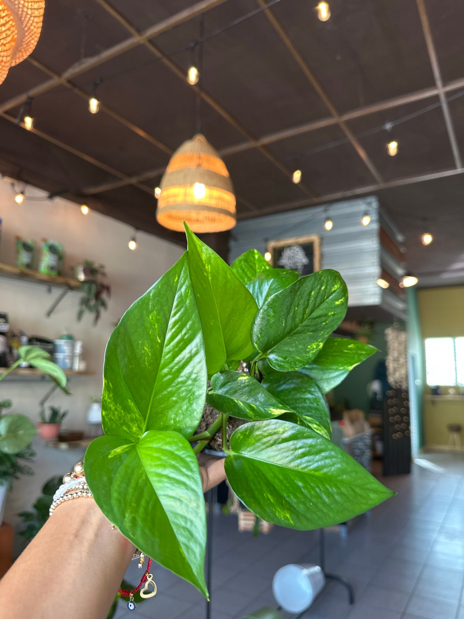 Planta de interior resistente y versátil, conocida por sus hojas verdes brillantes y su crecimiento vigoroso. El Pothos es ideal para principiantes y para quienes buscan una planta agradecida que se adapte fácilmente a distintos espacios. Puede colocarse en repisas, macetas colgantes o dejarse trepar para crear un efecto más abundante y natural.